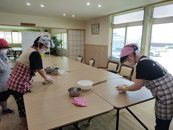 しながら生地を作りました。切るのは職員に任せてあとは食べるだけ。